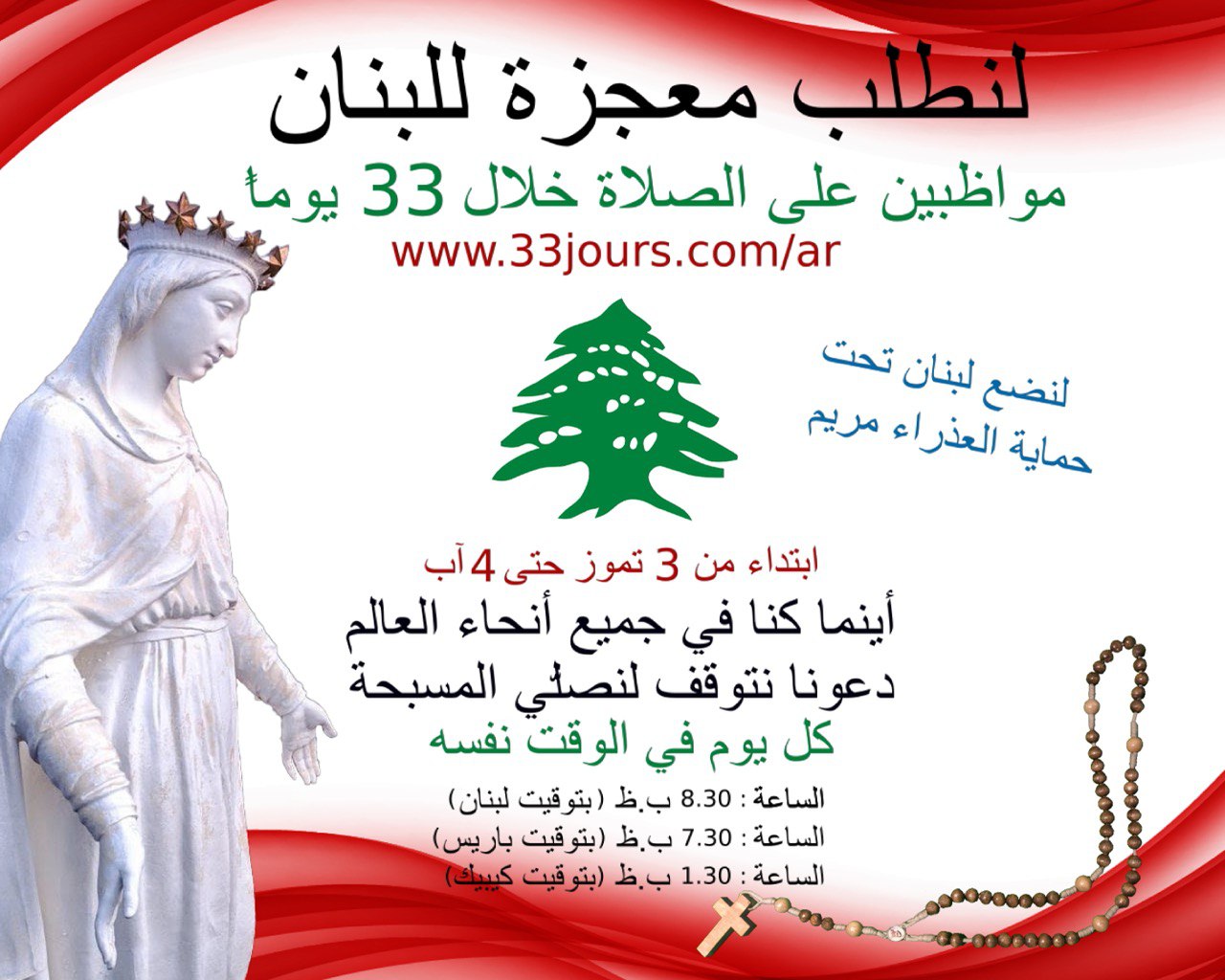 أينما كنتم في جميع أنحاء العالم ، توقّفوا لتصلّوا مسبحة العذراء مريم، كلّ يوم في الوقت ذاته (7.30 ب.ظ. بتوقيت باريس)، من أجل خلاص شعب ، من أجل خلاص لبنان ❤️صلّوا صلاة فردية أو عائلية أو جَماعية مع فِرَق الصلاة التي تنتمون إليها ...أو مع رعاياكم ، إلخ